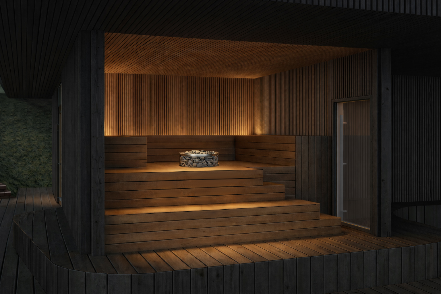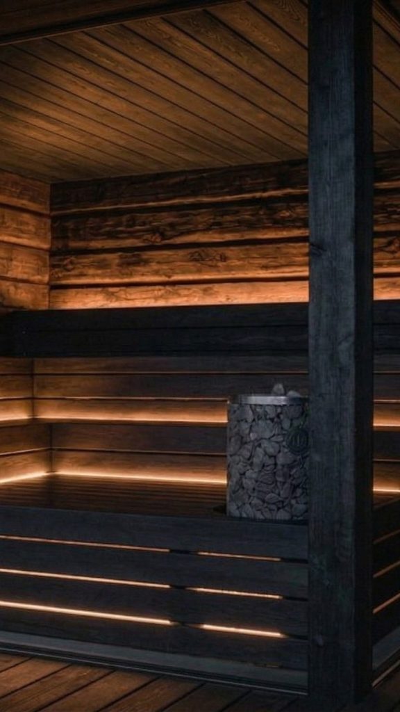 Saunarakennus sisältää erillisten pukuhuone- ja pesutilojen lisäksi kaksi eri tyylistä saunaa. Saunoista avautuu esteettömät näkymät Pyhäjärvelle. Saunarakennuksessa on myös kahvila sekä lounge tulisijalla.